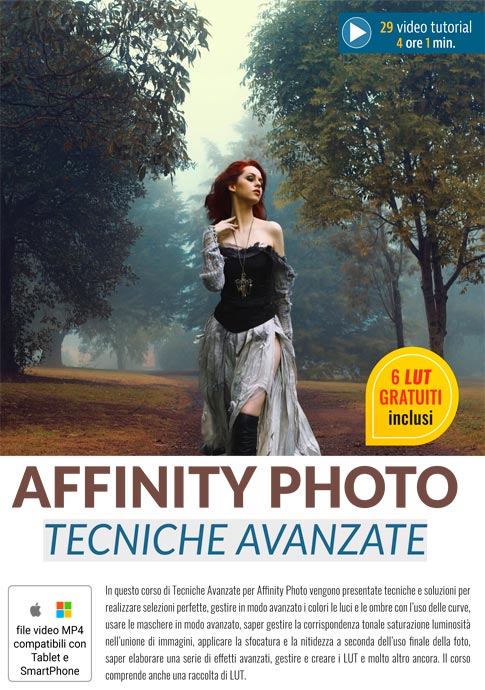 In questo corso di Tecniche Avanzate per Affinity Photo vengono presentate tecniche e soluzioni per realizzare selezioni perfette, gestire in modo avanzato i colori le luci e le ombre con l’uso delle curve, usare le maschere in modo avanzato, saper gestire la corrispondenza tonale saturazione luminosità nell’unione di immagini, applicare la sfocatura e la nitidezza a seconda dell’uso finale della foto, saper elaborare una serie di effetti avanzati, gestire e creare i LUT e molto altro ancora. Il corso comprende anche una raccolta di LUT.